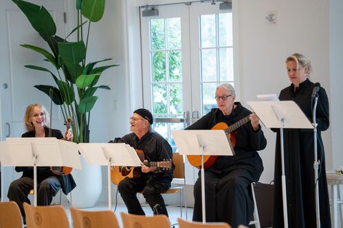 Waterfront worship is shaped by musicians on guitar and violin, joined by a cantor, creating a worship experience that blends contemporary language with ancient and modern hymns.